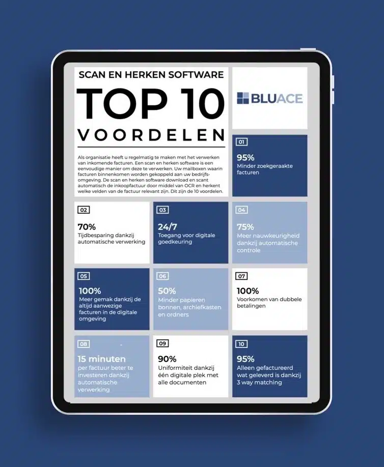 Als organisatie heeft u regelmatig te maken met het verwerken van inkomende facturen. Een scan en herken software is een eenvoudige manier om deze te verwerken. De scan en herken software download en scant automatisch de inkoopfactuur door middel van OCR en herkent welke velden van de factuur relevant zijn. Download de handige infographic over de voordelen van een scan en herken software.