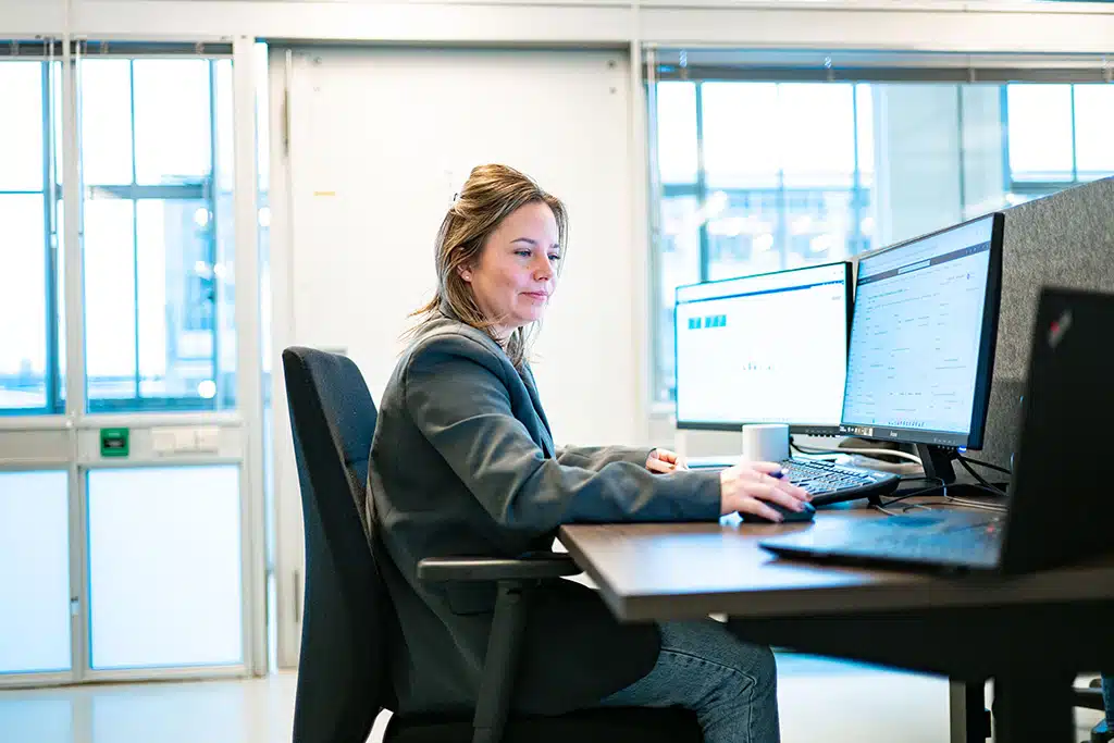 Een foto van twee medewerkers in de kantine van Bluace die op een laptop kijken