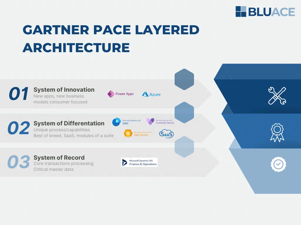 Microsoft has also adapted to this development. Where Dynamics 365 was initially designed as an all-encompassing system, it is now a collection of smaller applications forming a complete solution. Gartner’s pace-layered application model shows that the Microsoft Dynamics 365 ecosystem is present at all levels, from the basics to the more advanced and innovative layers.
